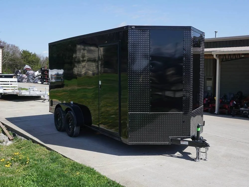 7'x16' enclosed trailer. Requires a 2-5/16" ball.This dual axle trailer can be pulled with any midsize truck. It has 4 tie down points at all 4 corners. This trailer is perfect for hauling lawn equipment, side × side, Motorcycles, Larger equipment while having the peace of mind of your valuables being secured and out of the elements while in transport.